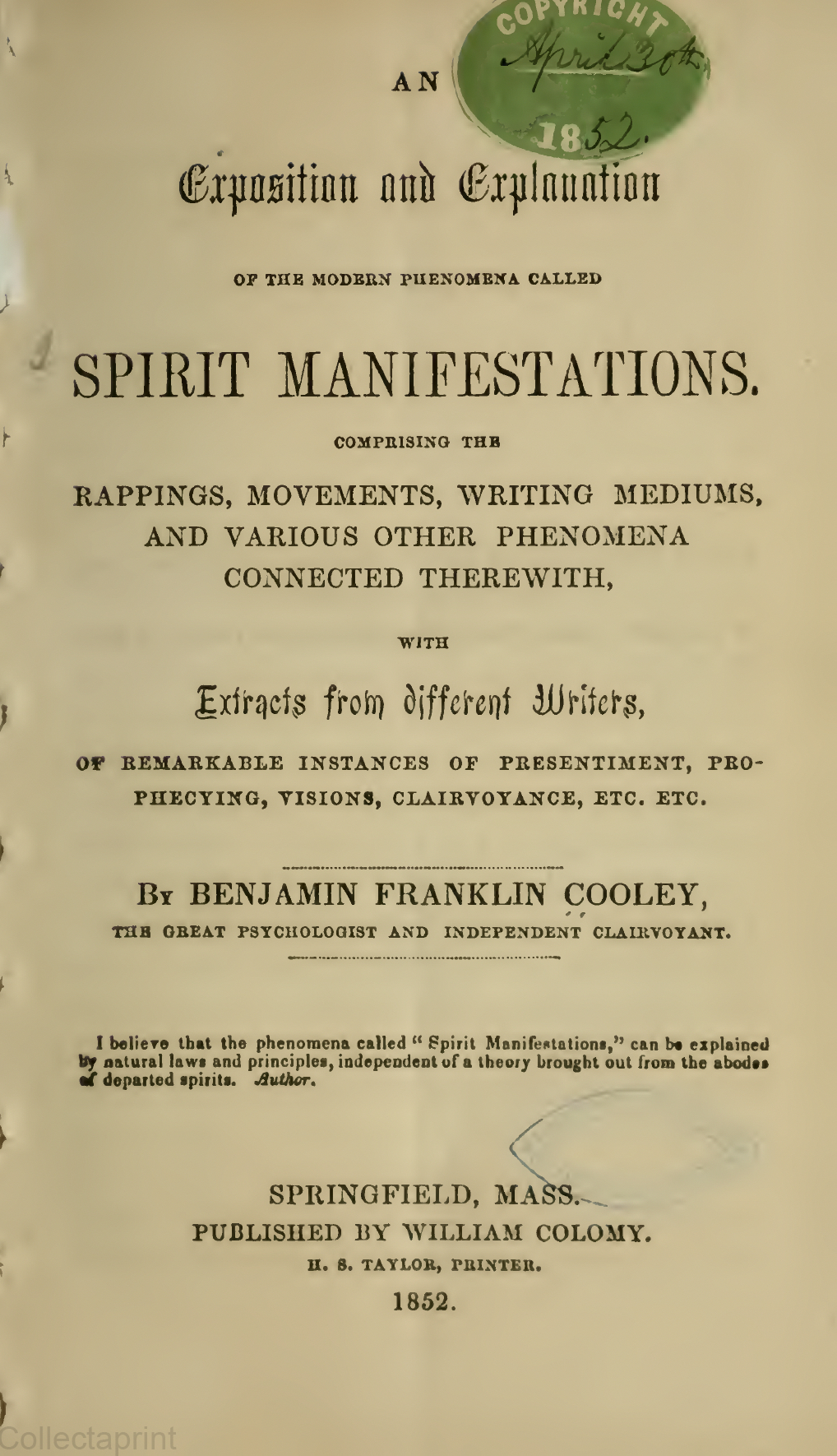 For, in the yet unexplored fields of the electric element, and the application of this same element as a medium from matter to mind, and also the yet dark and misty realms of clairvoyance, with the intuitive principles of mind-all these, taken in connection, present a wide and almost unbounded field, respecting which the great mass of minds know but little. And as many friends have often requested us to publish to the world the results of our somewhat extended investigations, we have at last reluctantly yielded to such requests; thinking that perhaps we might have obtained some ideas that would be aids to the minds of the earnest seekers for the truth, respecting this all-engrossing phenomena. But to one class of minds we have a word to say, that does not pertain to this phenomena. That class comprises the critic, whose greatest passion seems to be to seek and trace out grammatical errors, and hurl them as cudgels to the head of the writer. Now, dear critic, we pray you forbear; for we do not present the following pages as a regularly prepared and studied book, but merely as broken sentences, extracts, and illustrations. And hoping that the reader may obtain some ideas that will aid him in his researches respecting this new phenomena, we submit the following pages to him and the public.