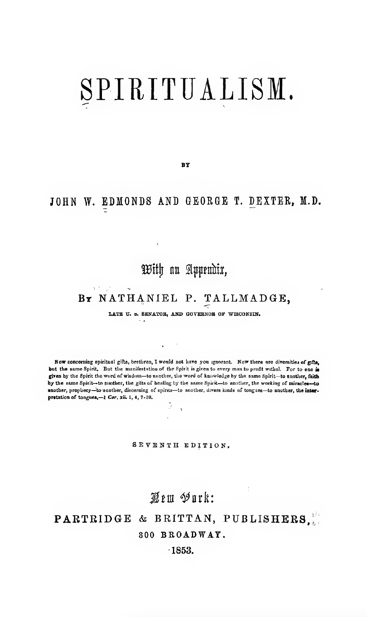 The undersigned first became personally acquainted in April, 1852. They had both been engaged in the investigation of spiritual intercourse, and they occasionally met at circles during the ensuing summer. But in the spring of 1853, after the Judge's return from an absence from the country of nearly four months, they met again, and agreed to conduct their investigations together, and with renewed energy.