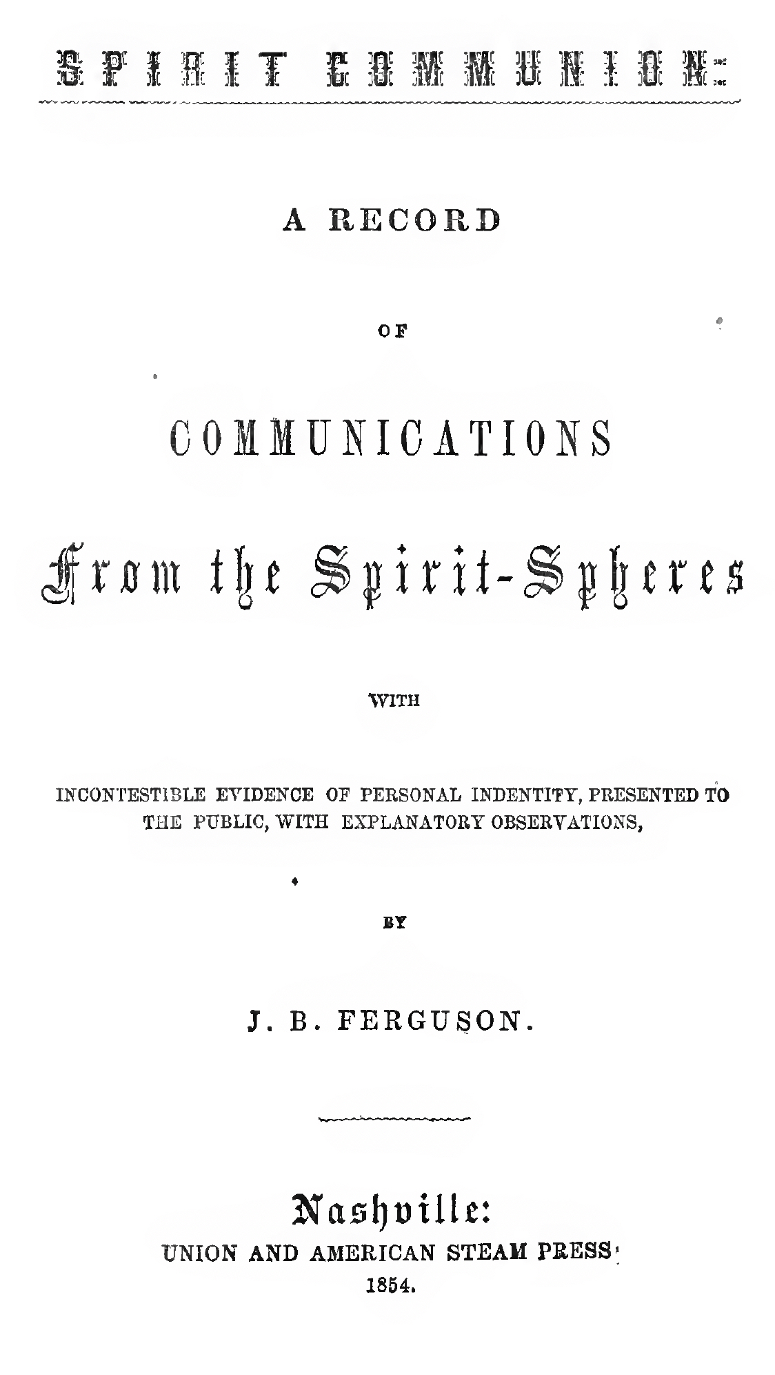 The Records of communication with the high-born spirits of another sphere, now presented in the following pages, were made for the most part, without reference to the public. We took them down as worthy of preservation among our private records, and the thought never entered into our mind that they would be spread before the reading world, till we were called upon by our Spirit-monitors to know, whether we would confine such blessed intuitions of divine wisdom and love to our narrow circle, or give them forth to relieve and elevate a common Humanity. We were called to a sense of our responsibilities and privileges by being reminded that we were in danger of undervaluing those benign influences, intended to follow man from his cradle to his grave; that the knowledge of their enjoyment by any would serve to awaken our fellow-mortals to their just appreciation of most blessed privileges, and bring them to a sense of their gifts as men, inherited from their God, out of which so many have been cheated by false fears and unlicensed assumptions over their Spiritual Nature; that the most hallowed influences would every where accompany and surround these evidences of Spirit-influx, awakening desires, high and holy, that cannot be satisfied short of the great ultimate of universal good promised and found in the recognition of an eternal destiny: when each shall know that God is the Universal Parent—Man the Universal Brother, and an endless Union and Felicity the Universal End of all rational intelligences. We were fully satisfied, by the most graphic and enlightened evidences, that it was not to destroy or subvert any just conception of the good, useful, or beautiful in human organizations for mutual help; not to dim any exalted recognition of virtue, or virtuous conduct that makes the man and elevates him above the brutal tendencies of a misdirected fleshly nature; but to instil within the fermentations of his thought that which shall cause it to ascend in unison with every holy desire to be benefitted and to benefit others. We believe they will aid man, every man, rationally and charitably to regard the differences between man and man, and break down the despotic sway over human consciences, which has clouded and deadened their highest sense of right, and deprived many of recognising their true and common paternity in God. To beliefs that the recognition of the impress of God upon every heart, which Spirit-intercourse invariably invites, will breathe forth any thing but purity and preparative longings for the highest ends of virtuous devotion, is only to reveal, to the heart thus believing, its own traitorous enslavement to an authority that robs us of our highest aims in our estrangement from the fount of life immortal. Like seeks its like with unerring aim, and God recognised in the soul will only lead us to higher and purer knowledge of his purposes and ways. . ..
