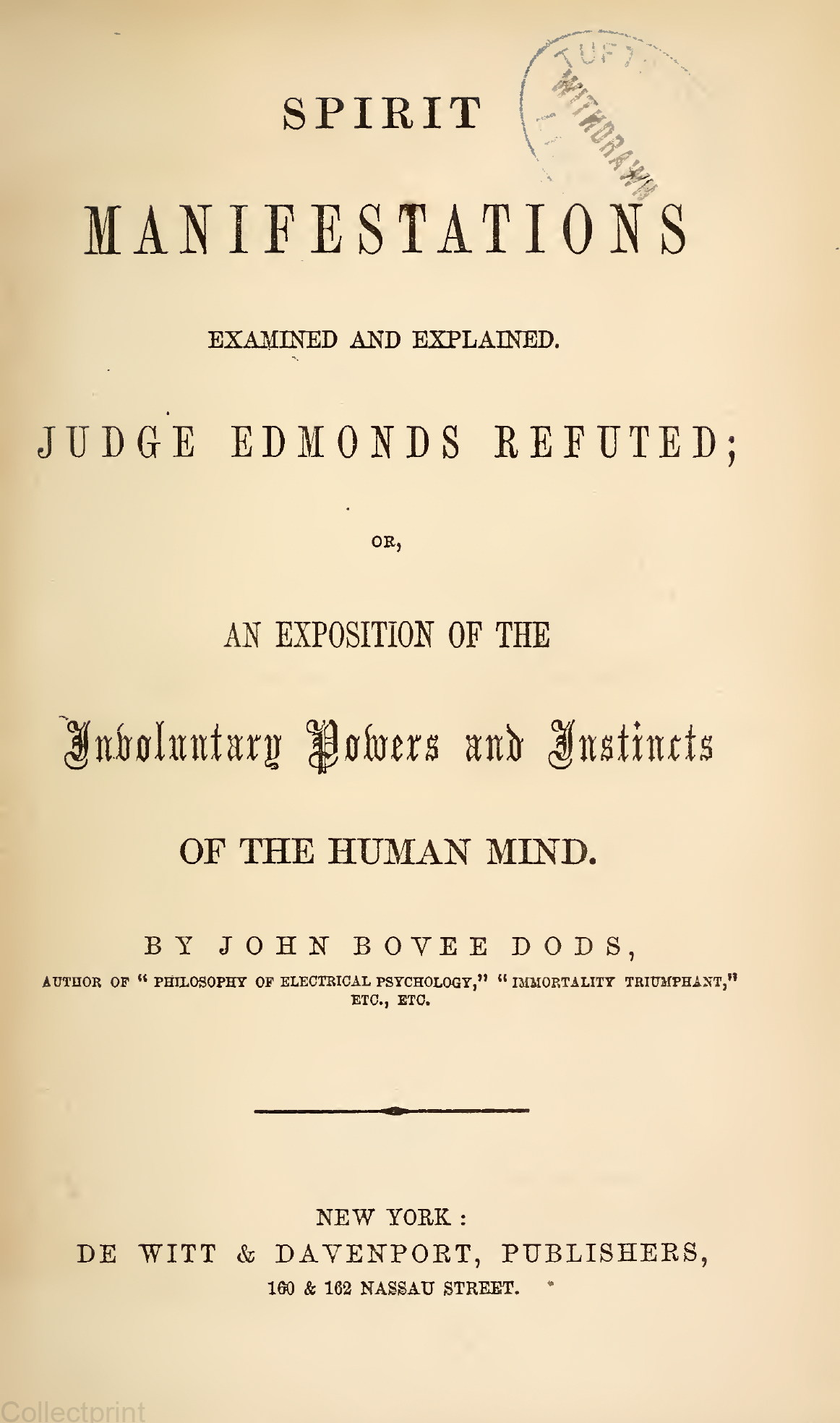 I will now say that I had abandoned the idea of publishing my views in connection with the spirit-manifestations and had concluded to prepare a work devoted exclusively to the exposition of the instincts of man as connected with the involuntary powers of his mind, which, as a branch of mental philosophy, has been entirely overlooked. But as Judge Edmonds, of this city, has just published a work in defence of the spirit-manifestations, and given the subject the weight and sanction of his judicial name, and even resigned his seat in consequence, as Judge of the Supreme Court, and as the doctrine is gradually assuming a more imposing attitude before the public, so I feel in duty bound to listen to the solicitations of my friends, and publish this humble effort of mine in the hope that it may do good.