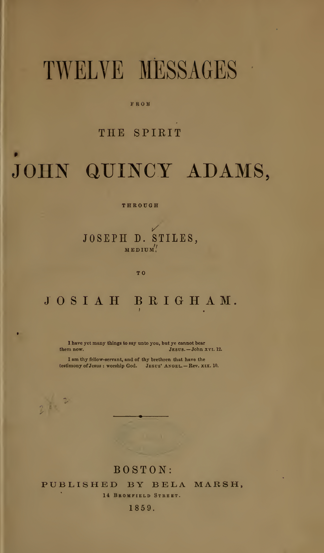 The messages contained in this book, coming from the immortal spirit of John Quincy Adams, were written out in manuscripts, at various times, at my house in Quincy, Mass., and at the house of my son-in-law, C. F. Baxter, Boston, during the last four years, through the hand of Joseph D. Stiles, medium, when in an entranced state, and who, at the time of writing them, was unconscious of what was being written. The whole was written in an almost perfect facsimile of that peculiar, tremulous handwriting of Mr. Adams in the last years of his earthly life,—a handwriting which probably no man living could, in his natural state of mind, so perfectly imitate, and which is wholly unlike the usual handwriting of the medium. The writing of these messages in manuscript was commenced in August, 1854, and closed in March, 1857. The medium (in trance) commenced copying and revising them for publication about the first of April following, and finished in June, 1858, making some additions and some omissions.