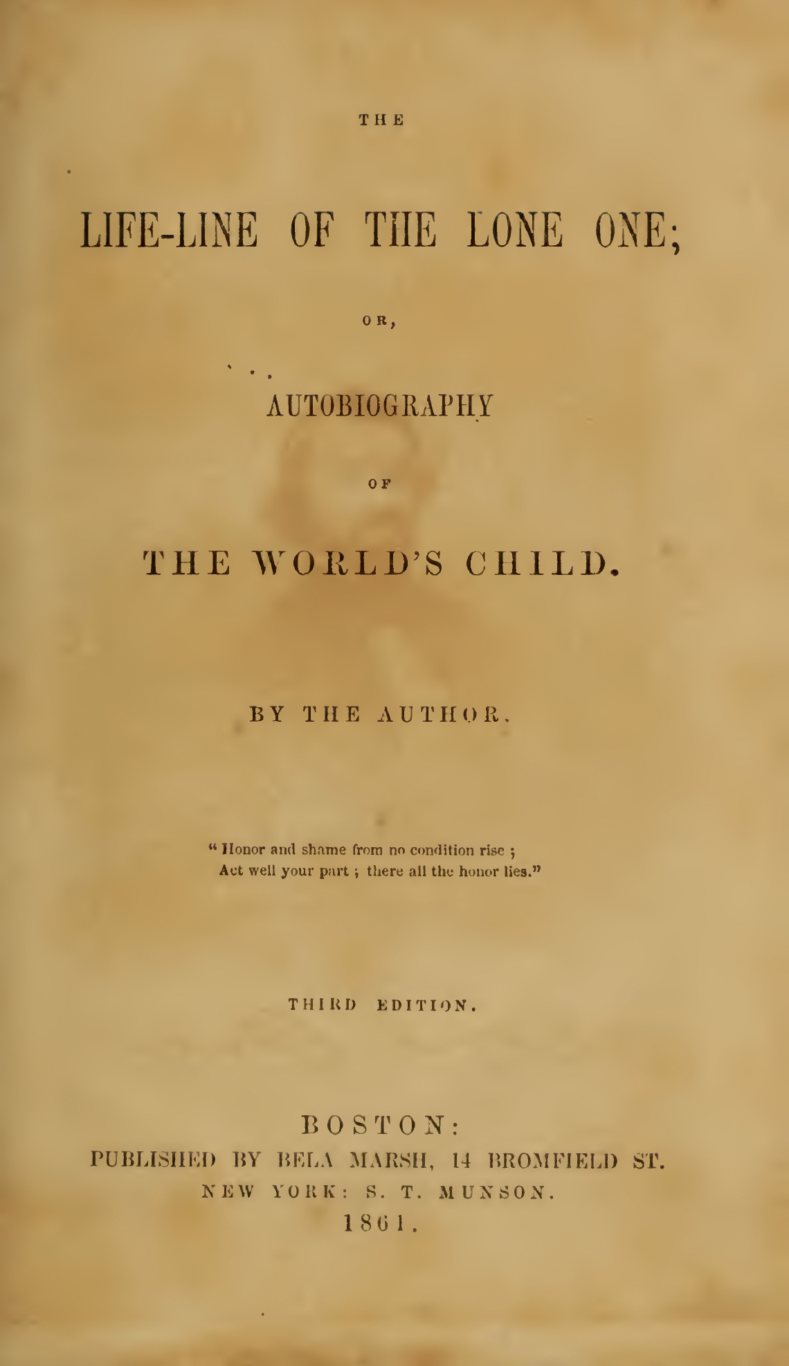 This little volume—a true and literal history of the struggles of an ardent and ambitious mind to rise from a dishonourable birth, and the lowest condition of poverty and New England slavery — is published more for a guide and advice to those who live in the humble walks of life, and for a rebuke on the tyrannical and malignant spirit of arrogant and selfish individuals and societies, who ever attempt to trample upon and despise such reformers as attempt to rise, by individual effort, to distinction or fame, than for the book market, or for the pecuniary reward it may bring the author. The name is only left in obscurity to those who are unacquainted with the subject of the narrative; and to such it is of no value. The subject of the narrative has passed to a plane of reconciliation and harmony, in which he feels only a spirit of forgiveness for those whose consciences have already punished them for their physical abuse, or moral and religious misrepresentations, slanders, and falsehoods, or their political curses.