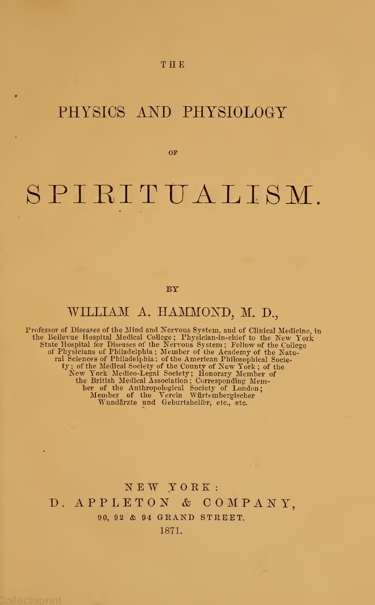 Professor of Diseases of the Mind and Nervous System, and of Clinical Medicine, in the Bellevue Hospital Medical College; Physician-in-chief to the New York State Hospital for Diseases of the Nervous System; Fellow of the College of Physicians of Philadelphia; Member of the Academy of the Natural Sciences of Philadelphia; of the American Philosophical Society; of the Medical Society of the County of New York; of the New York Medico-Legal Society; Honorary Member of the British Medical Association; Corresponding Member of the Anthropological Society of London; Member of the Verein Würtembergischer Wundärzte und Geburtshelfer, etc., etc.