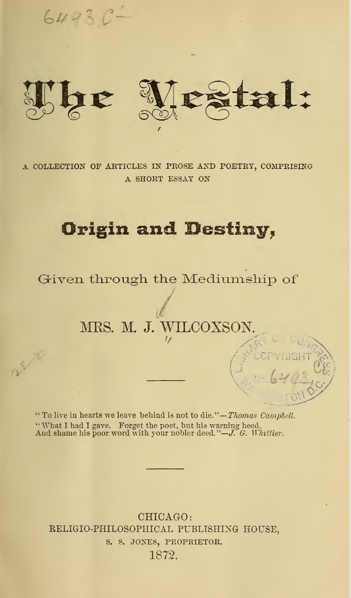 Having been many times solicited to publish some of the poems which have been given to me, I made the experiment by sending out those little waifs, "The Midnight Prayer" and "The Festival Night," and such has been the demand, especially for the former, that I am encouraged to reprint it, in connection with other poetic produc-tions, some of which were first given impromptu at the close of my lectures. Suffice it to say there was a time in which these impromptu poems were frequent, and of so marked a character as bearing upon subjects suggested by the audience after my taking the stand and passing into the inspirational or entranced condition, that they have proven good tests in the minds of many of my hearers. Though not knowing, or having the faintest idea of what subject might be presented, a sort of previous mental illumination would take possession of me, in which detached, broken clauses and stanzas would sweep across my mind, with no consecutive connection, but, on the other hand, fragmentary and fractional; and, to my surprise, I found that when more perfectly under control in my public labor, these parts of stanzas, at first seemingly disjointed and unsatisfactory, were so arranged and filled out as to produce a perfect poem. Being urged to reproduce these effusions, I began the experiment alone in my room by calling upon the same intelligences, invoking the presence of these controlling teachers; and though there may not always be a complete duplicate, I feel that there has been little difference in language, and that the original sentiment or moral has been strictly preserved.