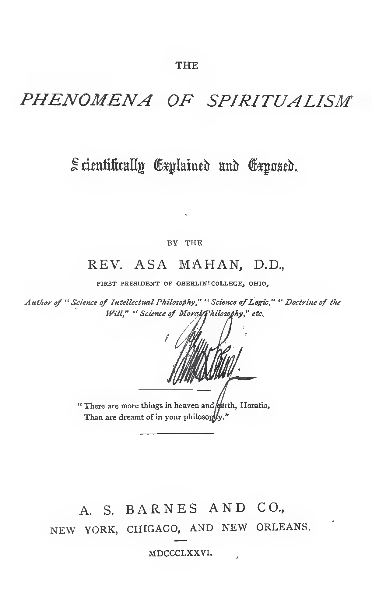 The Admitted Fact, that an Essential Part of these Phenomena are Undeniably Originated by Exclusively Mundane Causes, Requires, without absolute proof to the contrary, that they all to be Referred to the same Causes; No New, and none but Exclusively Mundane, Truths are Represented in these Communications; All these Communications take Specific Form from the Known Sentiments in the Particular Circles in which said Communications Originate; Known Exceptions Confirm the Deductions under Consideration; The Character of the Affirmed Spirit-thoughts, as Contrasted with the Known Life-thoughts of Individuals, Evince the former as having none but a Mundane Origin; Revelations which do not, as Contrasted with those which do, Originate in these Circles, Confirm the same Conclusion; The General Intellectual Character of these Communications Demonstrate their Non-Spirit Origin; Fundamental Facts Developed by Individuals through Inquiries made for self-satisfaction in regard to the Origin and Cause of these Phenomena, Individuals who had Formed no Definite Theory upon the Subject The same Responses and the same Evidence of Spirit presence, can be Obtained from the Spirits of Individuals yet alive, but supposed to be dead, as from the Spirits of Persons actually dead; Similar Responses are Obtained in these Circles, by devoted Spiritualists, from the spirits of persons actually alive, but supposed to be dead; Most Decisive Observations and Experiments made by Individuals of the highest intelligence and integrity, for the specific purpose of Determining the Nature and Location of the Cause of these Phenomena (Very Interesting and Decisive Facts furnished by one of our former Pupils; Facts which occurred at the house of the Rev. Starr King; Important Facts furnished by Dr. Bell; The Statements of Dr. Bell confirmed by kindred ones from N. I. Bowditch, Esq.; Important Facts furnished by a New England Congregationial Clergyman; Interesting and Illustrative Facts furnished by a Pastor of one of the Churches in the City of Cleveland, Ohio); A Peculiar Class of False Answers continually Obtained in these Circles Evince the Exclusively Mundane Origin of these Phenomena; Enquiries made for the Specific purpose of Determining, not only the Location of the Controlling Cause of these Phenomena, but of the Extent of the Control which could be Exercised over these Phenomena; Important Evidence Obtained from the Observations and Testimony of Individuals who have themselves been Mediums; Disagreements and Contradictions in these Communications Incompatible with the idea of their Extra-mundane Origin; False Communications which can be accounted for but upon the Mundane Hypothesis.