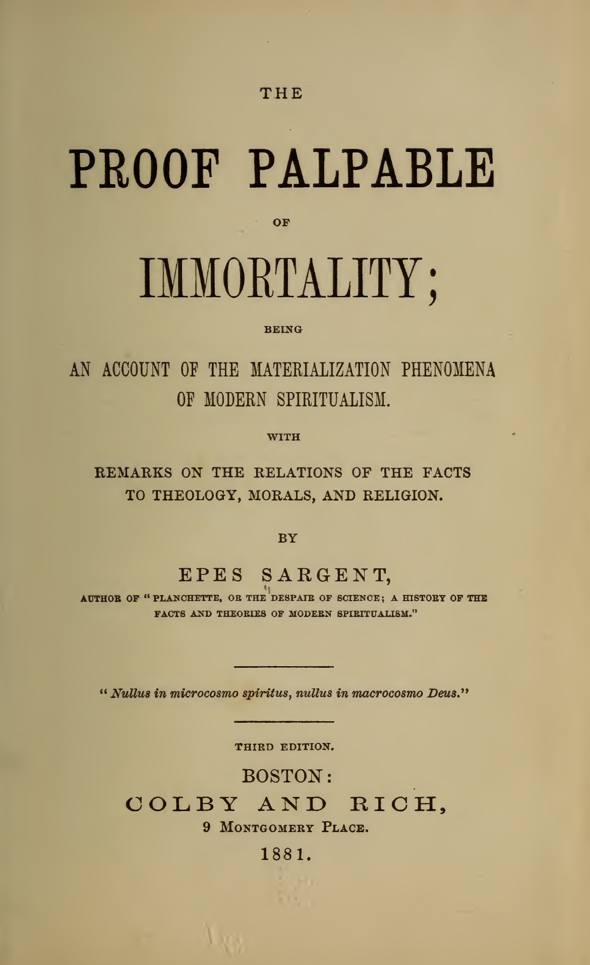 - How far the senses teach us—Two entities or one—Man a trinity—Testimony of seers—Skeptical exclusion of causation—Spiritualism extends the realm—On photographing spirit-forms—Papillon on Matter—Hegelian doctrine of nature—Mr. Lewes" s objections answered—Ferrier's abuse of Spiritualists—What is meant by spirit—First Causes—The Deific Nature.
