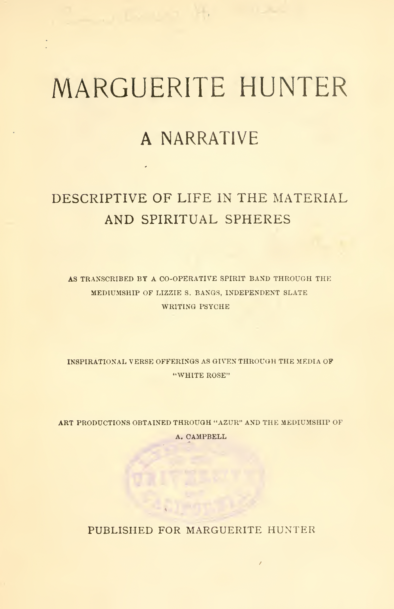 The circumstances that led to its translation from the spiritual spheres are of themselves a wonderful demonstration of the book's intrinsic worth and its heavenly origin. The author of this introduction, whose guide dictated for the author of the narrative the present form of the book, was impressed a year ago, March, 1893, to write a short protest against the Meyer's bill, a bill which was then pending in the Illinois state legislature and which was a stab at mediumship, Spiritualism and the exercise of the rights of a citizen of his constitutional, religious freedom; and having written it, he sent it to a Chicago newspaper, in which it shortly appeared. It was read by the hero of this narrative, Mr. C. H. Horine, and was so thoroughly appreciated and approved of by him, he being a Spiritualist and the writer a Unitarian clergyman, that he sent a congratulatory letter to him. Strange to say, this one letter led to a steady correspondence and friendship between them, which, by a series of collateral, both material and spiritual events, of which they were not aware but which seemed to come as the evolution and product of the friendly union, brought about the outworking in material form of the design of the spirit intelligences who, it was afterward learned, first inspired the writing of the protest and the letter of congratulation that followed, and secondly, brought together by such means the forces and affected the organisation of the spirit bands and co-workers on both sides for the work and completion of the translation of the book. That such combination of forces and intelligences was necessary to the successful unfoldment of the work, the guides of the media who assisted the author of the book spiritually, and the mediums themselves through whom the book in all of its parts came, do attest. This was not done in the dark but openly and in the daylight. The guide of "White Rose," who dictated materially and inspirationally the form of the bock for the author in spirit life, together with the guides of Lizzie S. Bangs who assisted the spirit band who transcribed the book in material writing and who call themselves "Everlasting Unity," also "Azur," the guide of A. Campbell, who precipitated the paintings on porcelain, and Mr. C. H. Horine, his spirit friends and she who is his real co-partner, the heroine of the narrative, all had to be brought together and their forces combined before one word or symbol of the narrative could be received. All this elaboration of the program of work was so silently planned and unfolded, as a whole unconsciously to the earth media, that each one of the mediums employed knew of the book but not of the part he or she should play or take until the first instructions, which were given in November, 1893, had been received. Then the earth instruments looked back over the past months and saw and realised the purpose and design in all that had transpired. Thus the book was begun and thus it was ended by "Everlasting Unity" through their earth media, chosen and brought together to one place for this one noble work. It can be said finally that the paintings that are herewith presented as lucid illustrations of portions of the narrative, in half-tone reproductions, were given in oil on porcelain, enclosed within sealed slates, and each one was given through the mediumship of A, Campbell by his guide Azur; concerning the order and character of the subjects, neither A. Campbell nor Mr. Horine, who sat with him, were informed and hence they knew nothing. The spirit band gave the earth subjects and the character of their drawings as tests, and they were indeed tests, inasmuch as Mr. Horine on looking at them found them to be exact reproductions of the scenes in the old Kentucky home. The other drawings were scenes from the author's spiritual sphere, her home and surroundings. These paintings were finished, each one separately, in less than one hour at two sittings each, the longer time being used for exactness of detail. Concerning the material or independent writing, it was received by the independent process, familiar to all spiritualists, in the form and character as is illustrated by the photographs of slates given on separate sheets in the book. Mr. Horine sat through the entire series of sittings and has elsewhere testified to their receipt and genuineness. The psyche, Lizzie S. Bangs, received from six to eight full written slates at each of the sittings, Mr. Horine holding the slates with the medium, and these sittings were held three times a week and were begun in November, 1893, and were ended April 28th, 1894. It was the writer's pleasure to attend at least forty of them and he can testify and here testifies to the absolute genuineness of the slate writing as received through the psyche, Lizzie S. Bangs.