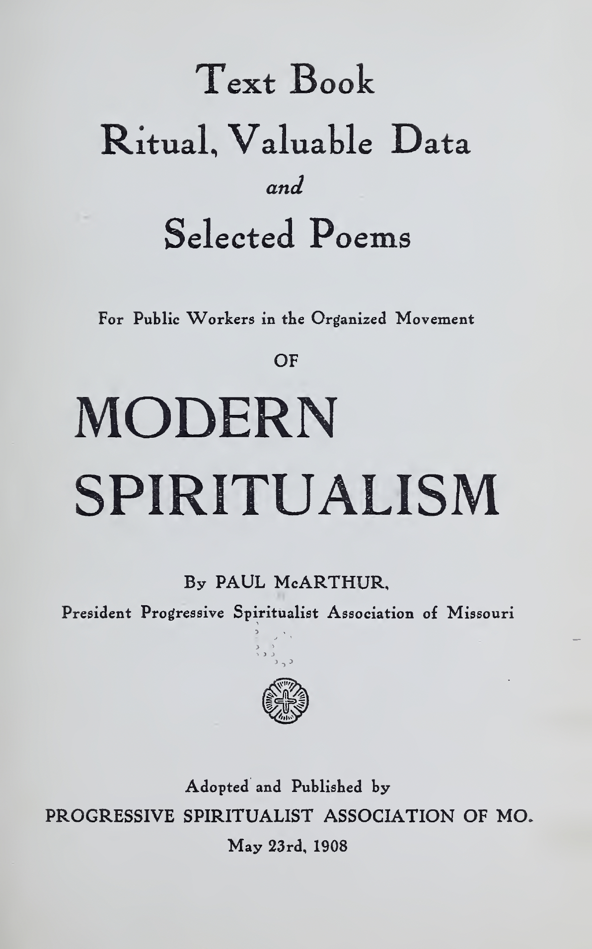 At the last annual Convention (1908) of The Progressive Spiritualist Association of Missouri, the complaint was made that at the present time there was not a single Text Book in existence from which our candidates for Ordination could be examined. The matter was thoroughly discussed by the present Executive Board with the result that the president and secretary were requested to undertake the compilation of a suitable work of this kind. The work has been carried out by President McArthur, Dr. Vierling's arduous professional duties having rendered it impossible for him to actively co-operate. The author has from time to time, however, submitted to the doctor for inspection his efforts and the discussion pro and con between them has aided materially in bringing about the desired results. Mr. McArthur desires to state that he has quoted freely from the works of older and more capable writers and has endeavoured to combine the best within his reach from all sources. The use of this book is not compulsory, but is simply the result of an earnest desire on the part of the present Board to assist as much as possible all who desire to better equip themselves as public workers in the Organised Movement of Modern Spiritualism.