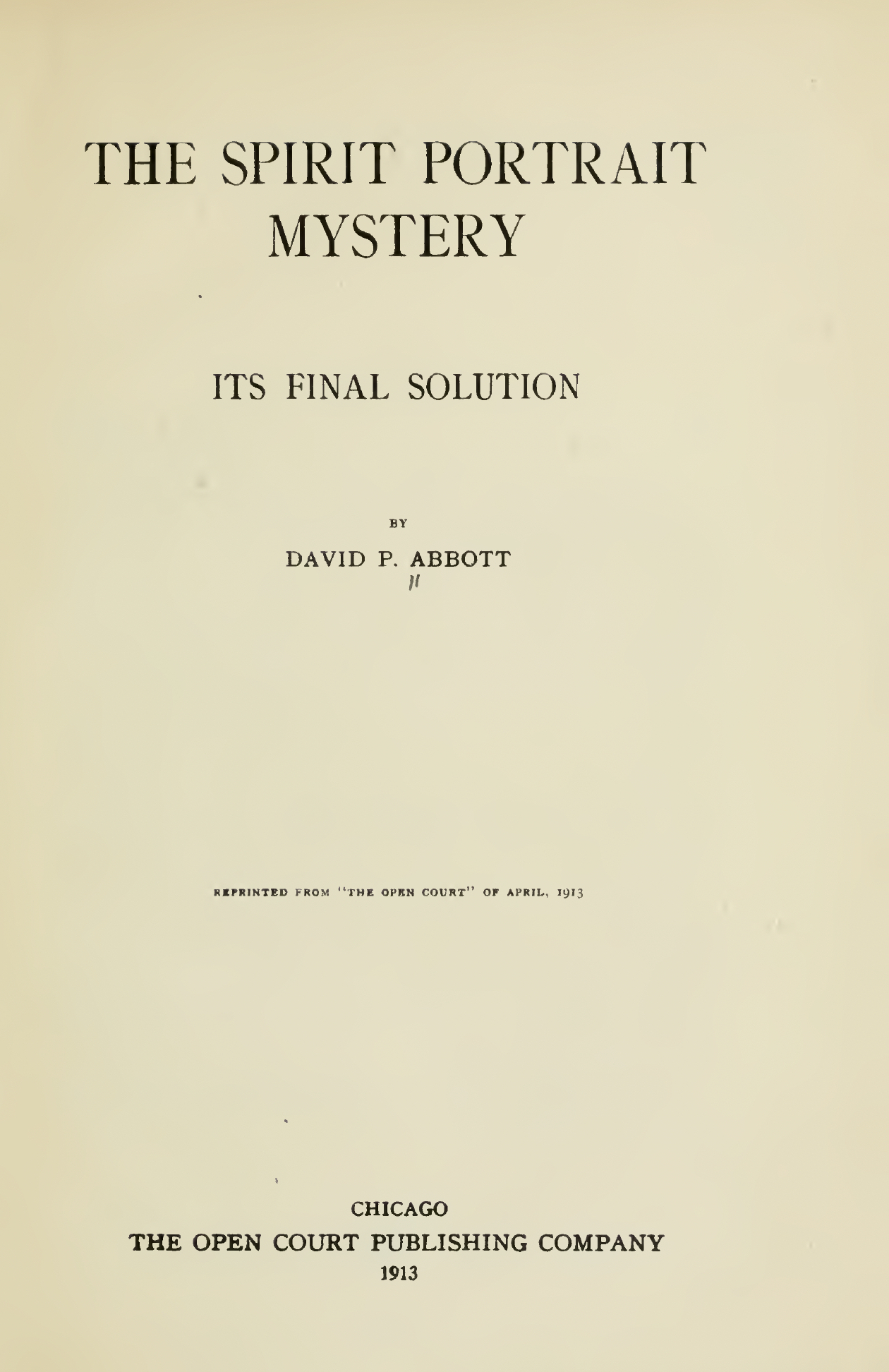 Mr. David P. Abbott of Omaha, Nebraska, a genius in mediumistic lore, the author of the remarkable book Behind the Scenes with the Mediums, was for a long time puzzled at the marvel of some well-known mediums, two sisters, who made the pictures of dead relatives appear in colored painting before the eyes of their sitters. We need not repeat reports of Spiritualists who were often overwhelmed at the spectacle, and even skeptics became convinced that here was true evidence of spirit life which would prove the immortality of the soul. From time to time Mr. Abbott communicated to us the gradual progress of his work including his disappointments when his theories proved incorrect, but he never lost the conviction that the mystery could not be a miracle and that because the trick was so effective it must be very simple.
