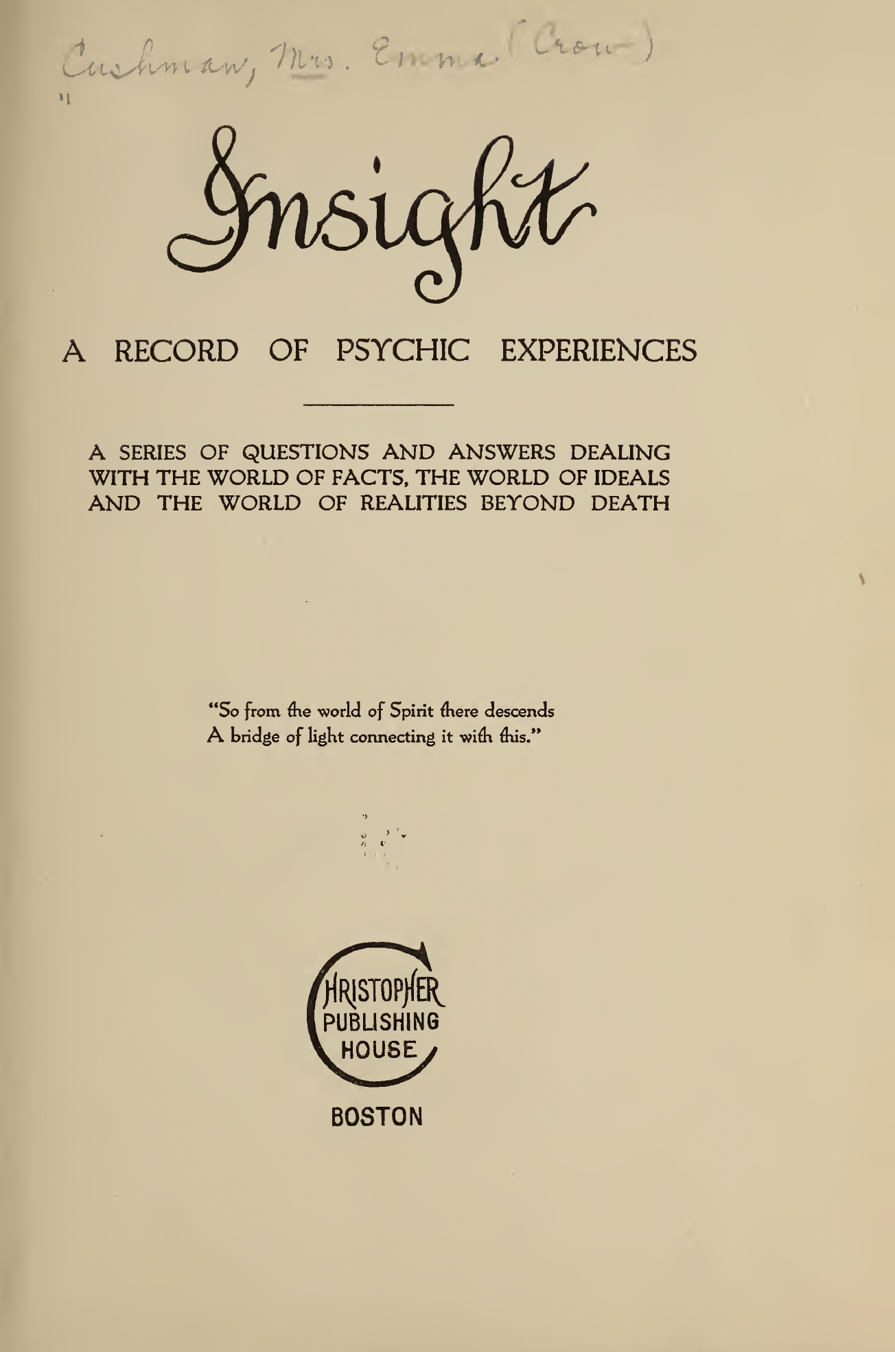 These communications were received by a small group of persons belonging to the same family, under the conditions more or less clearly indicated in the writings themselves. They purported to come from a very lofty spiritual influence who desired to be known by the name of Insight. He stated in our first interview in reply to urgent entreaty, that he had lived on this earth in the fifteenth century. He was a poor monk but he is now in one of the heavenly spheres and his mission is to teach those who are seeking spiritual knowledge. He preferred to call the members of the group by names symbolic of certain qualities—such as Aspiration, Courage and Endurance. His teachings contain great truths and since the beautiful personalities who bore these names have all passed into that higher sphere, so graphically described by Insight—this record is now published by one who discerns its great value.