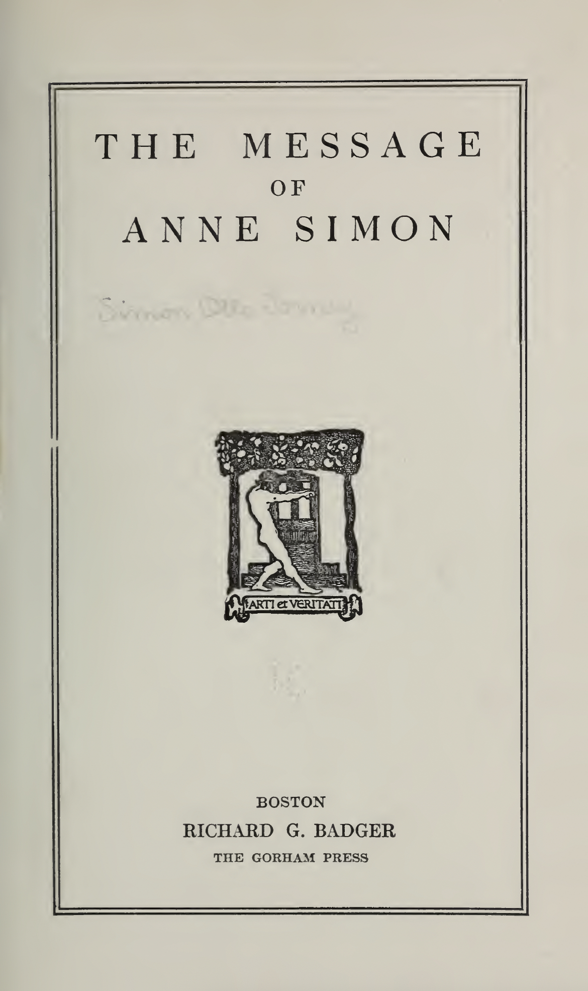 This is The Message of Anne Simon, my wife, who passed into the higher life on August 5, 1916. It was received under what I believe to have been inspirational influences, which, beginning about January 17, 1919, continued for twenty-five days, and then ceased. . . . "The Message is The Message! There is no more!" In this short time it was written, usually in the evening hours. The processes seemed normal. There was no trance condition, but the pencil moved swiftly, guided not by my will, and the contents, text and drawings, were evolved without my own mental or emotional stimulation. I was a passive instrument.