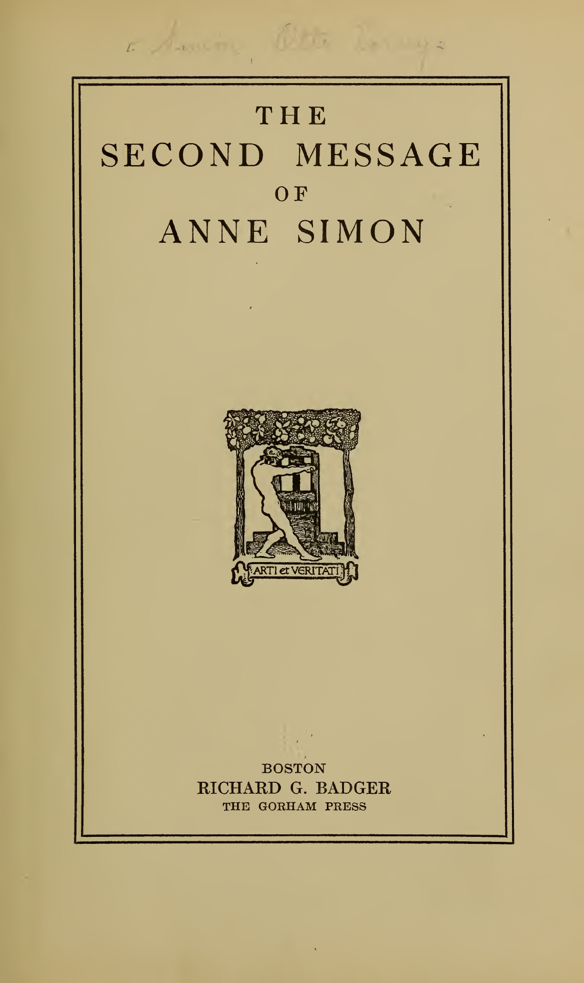 The Second Message of Anne Simon would seem to be a logical continuation of the contents of the first Message, already published. The third, fourth and fifth Messages have also evolved, and will follow sequentially in book form; each bearing relation to what has preceded; each of about the same length as the first Message; and each appearing in facile writing in the short duration of time of about a month. The Second Message began July 11, 1919, and ended a few weeks later, on August 7.