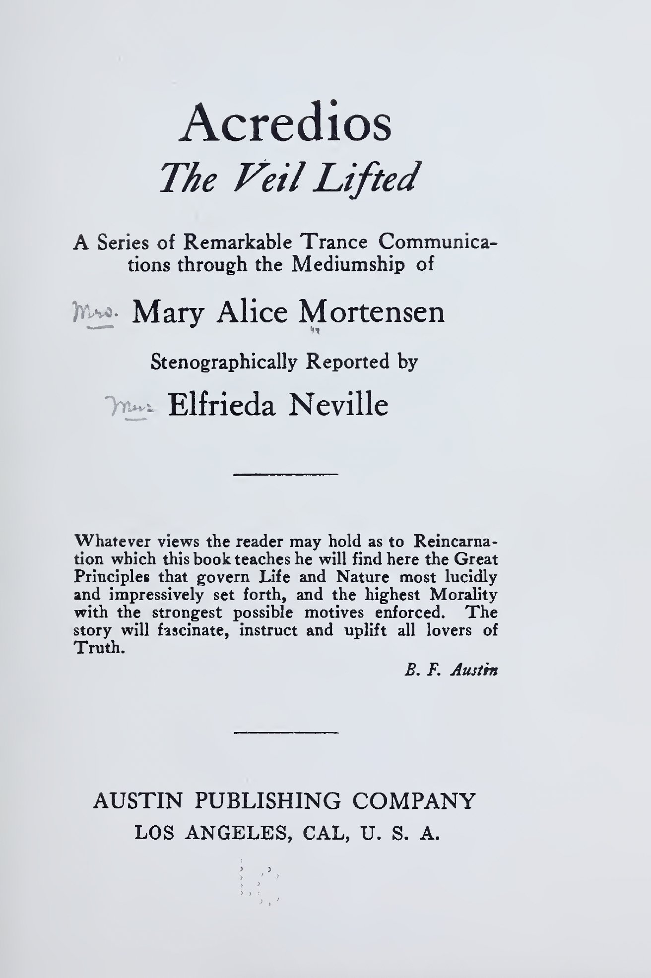 This little book is ready with its message. "I am Acredios.' 'So this noble spirit announced himself to Mary Alice Mortensen in the presence of Elfrieda Neville and delivered his first message. This first, second and third messages are set down from memory, as the recipients were unprepared to record them when received.