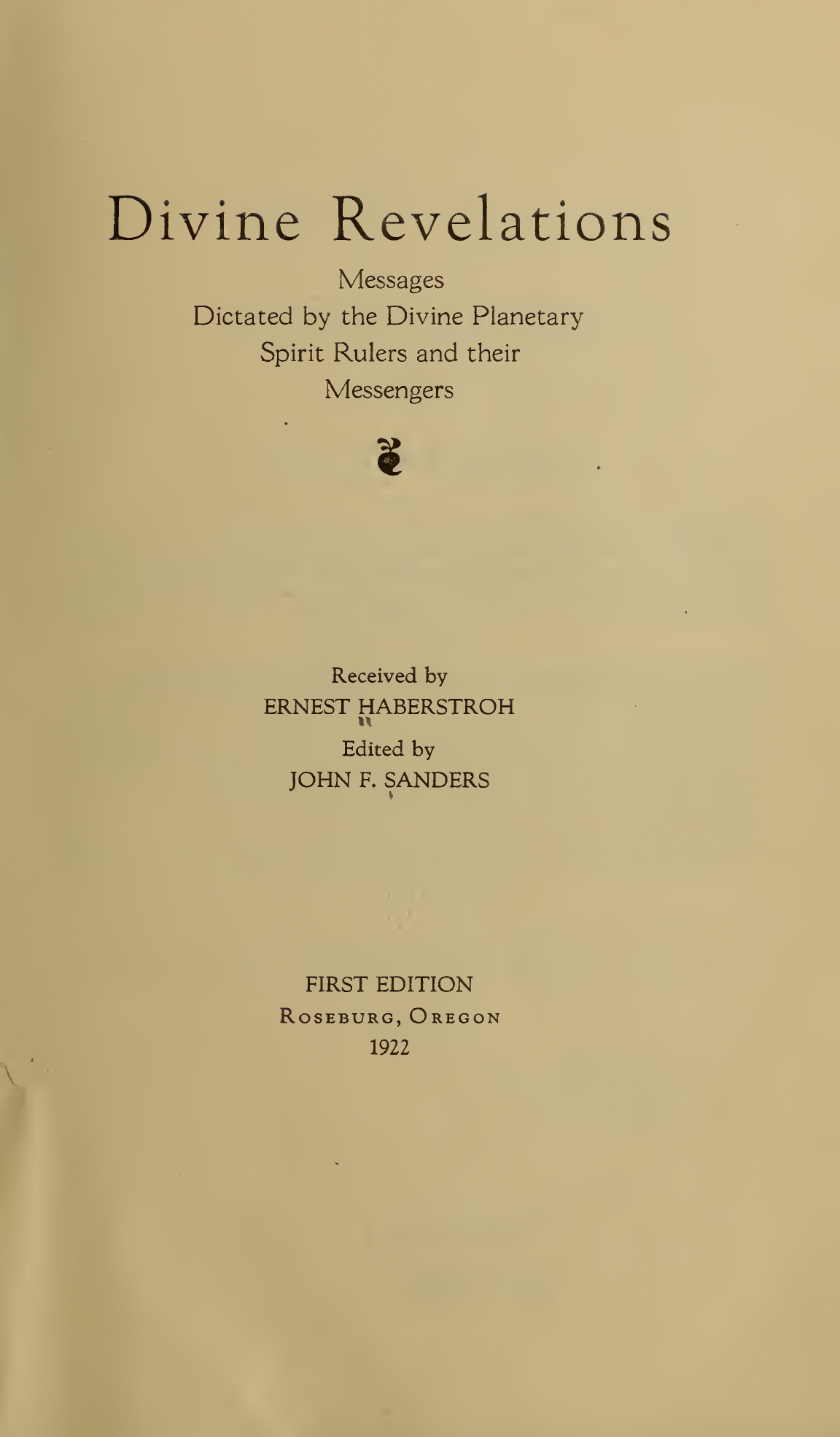 This little volume, entitled "Divine Revelations" is exactly and truly what its title claims for it; because it is a correct representation of the dictations of the high planetary spirit rulers, who administer and execute the Divine Will, not only on our Earth but also on all planets of our solar system, under the Divine guidance and rulership of the Holy Angels. The Holy Angels are under the direct control and orders of the great Creator and Ruler of this vast Universe, whom we call God, and whom we address as our Heavenly Father, and to whom alone belongs all the Glory, Power, Thanks and Praise forever. In this manner God controls the entire Universe and all the minute details in the same except the human race, because He created mankind to be a free agent, in order to work out their own salvation. In other words, man is left free to choose his own course in life; he is free to choose to be and to do good, or he may choose to be and to do evil; but he is held strictly accountable for all his acts, deeds, words and thoughts. In the majority of cases man is not called upon to render this account until he dies. At death the free agency of man comes to a sudden termination, at the same time man's spirit is carried to the very place where he belongs on the earth-plane also called the astral plane or the purgatory, all meaning the same thing, i.e., the first station below the first spiritual plane or station. The Earthplane exists in our atmosphere and is therefore a part of our Earth, hence called the Earth-plane. It extends Northward into the Dark-Satelite, which contains the Penitentiary in which spirits are imprisoned for their evil deeds and the suffering they have inflicted upon their fellow man, from which there is no escape until the last farthing has been paid. Another portion or place, in or near the dark satellite, but also a part of the Earth-plane, is called the North-pole, the place for those who have been punished by second death, i.e., from whom the Divine Ego or the God part of the human being has been taken away and who forever exist then as the beasts, but in human form, without any redemption throughout eternity; this is the severest punishment inflicted upon those human beings who lived a life of blasphemy and wickedness. …